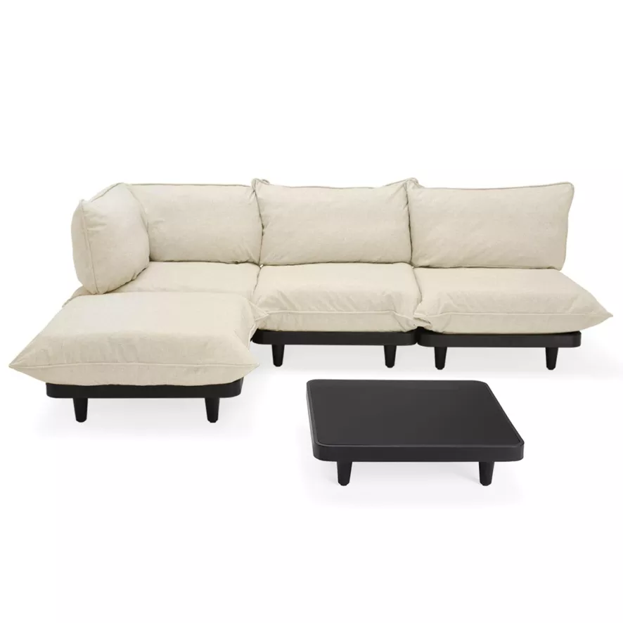 De Paletti loungeset 3-zits loungebank sahara + salontafel antraciet van Fatboy bestaat uit 5 losse onderdelen. Het hoekstuk en middenstuk (2 stuks) zijn 90 centimeter lang, 90 centimeter en 90 centimeter hoog. Het eindstuk, dat ook kan dienen als hocker, heeft een lengte van 90 centimeter, een breedte van 90 centimeter en een hoogte van 45 centimeter. De salontafel heeft een lengte van 90 centimeter, een breedte van 90 centimeter en een totale hoogte van 22,5 centimeter. De tafel is gemaakt van acryl en is afgewerkt met een Axalta coating die ervoor zorgt dat de tafel Uv-bestendig, waterbestendig en vlekbestendig is. Hierdoor kun je de tafel zowel buiten als binnen plaatsen. Het totaalgewicht van deze tafel is 14,36 kilogram.