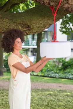 De Thierry le Swinger buitenlamp van Fatboy weegt 3,3 kilo en wordt geleverd met zowel een ophangkabel als een prikstok. De lampenkap is 40,5 centimeter bij 20,5 centimeter. De lengte van de stok is 75 centimeter, de lengte van de kabel is 320 centimeter. Zowel de kabel als de prikstok zijn beschikbaar is verschillende kleuren. De Thierry le Swinger is uitgerust met een LED-verlichting van 5 Watt. Het aantal lumen is 126, het aantal Kelvin 2700. Je kunt de lamp opladen met het meegeleverde USB-snoer. Het USB-snoer is 1,5 meter lang. Maak de buitenlamp schoon met een zachte doek, lauw water en vloeibare zeep. Vermijd schoonmaakmiddelen waar alcohol in zit.