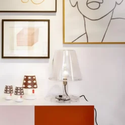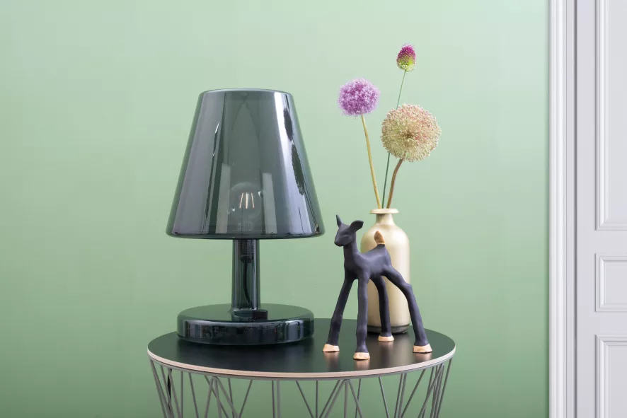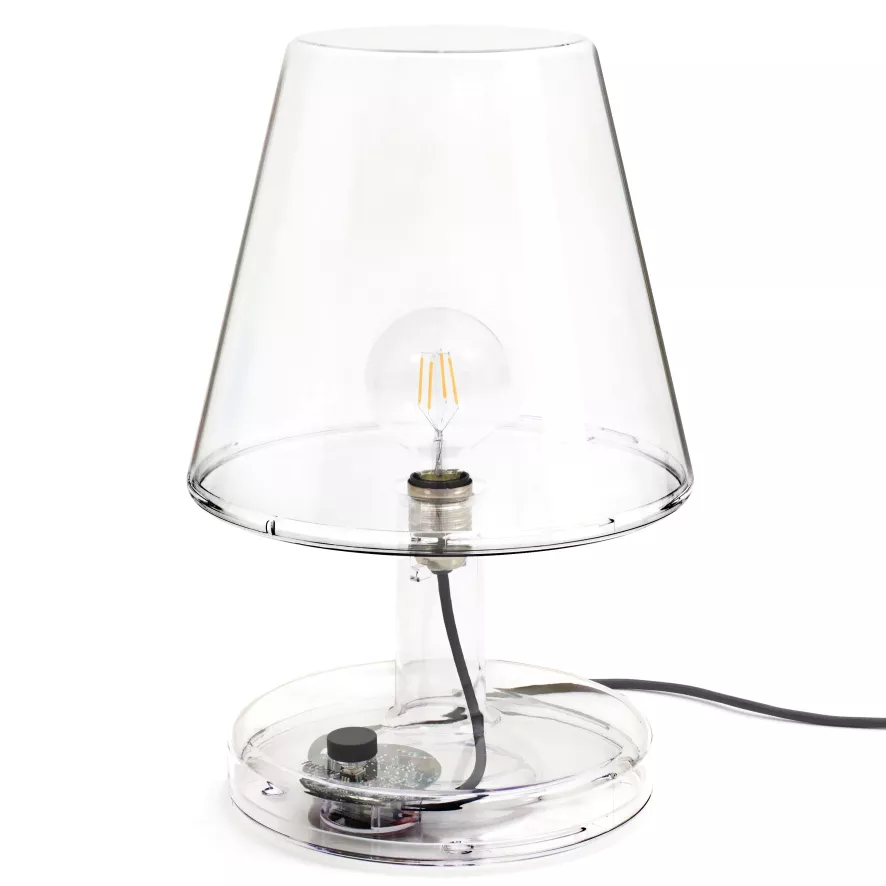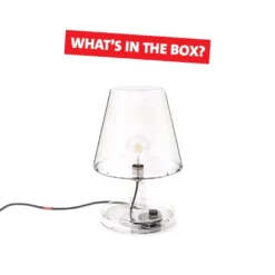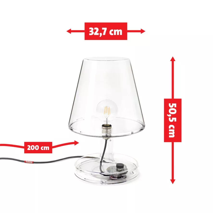 De Trans-Parents tafellamp LED van Fatboy is 50,5 centimeter hoog en 32,7 centimeter breed. Het snoer is 2 meter lang. De tafellamp is verkrijgbaar in verschillende kleuren. De LED-verlichting heeft 4 Watt en is dimbaar, dankzij de ingebouwde dimmer. Het aantal lumen is 440, het aantal Kelvin 2700. De Trans-Parents heeft een E27-fitting. Er kan een gloeilamp van maximaal 8 Watt in. Maak de Trans-Parents schoon met de meegeleverde microvezel doek.